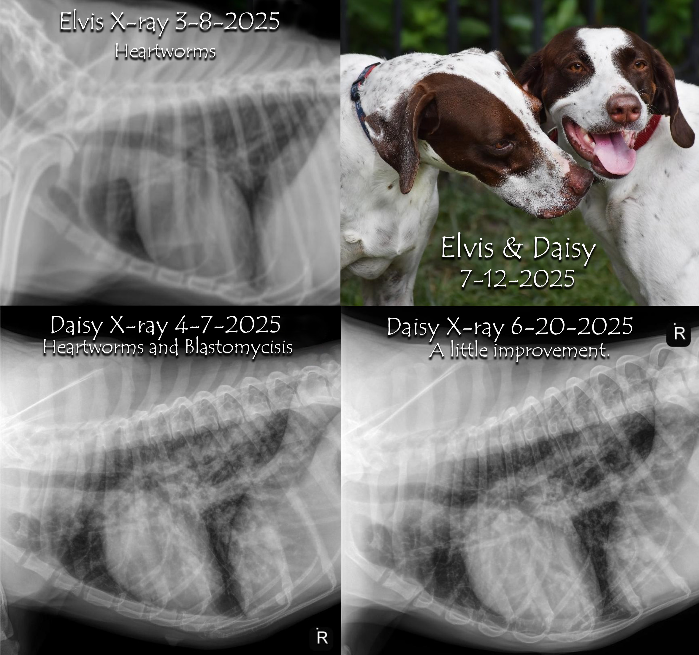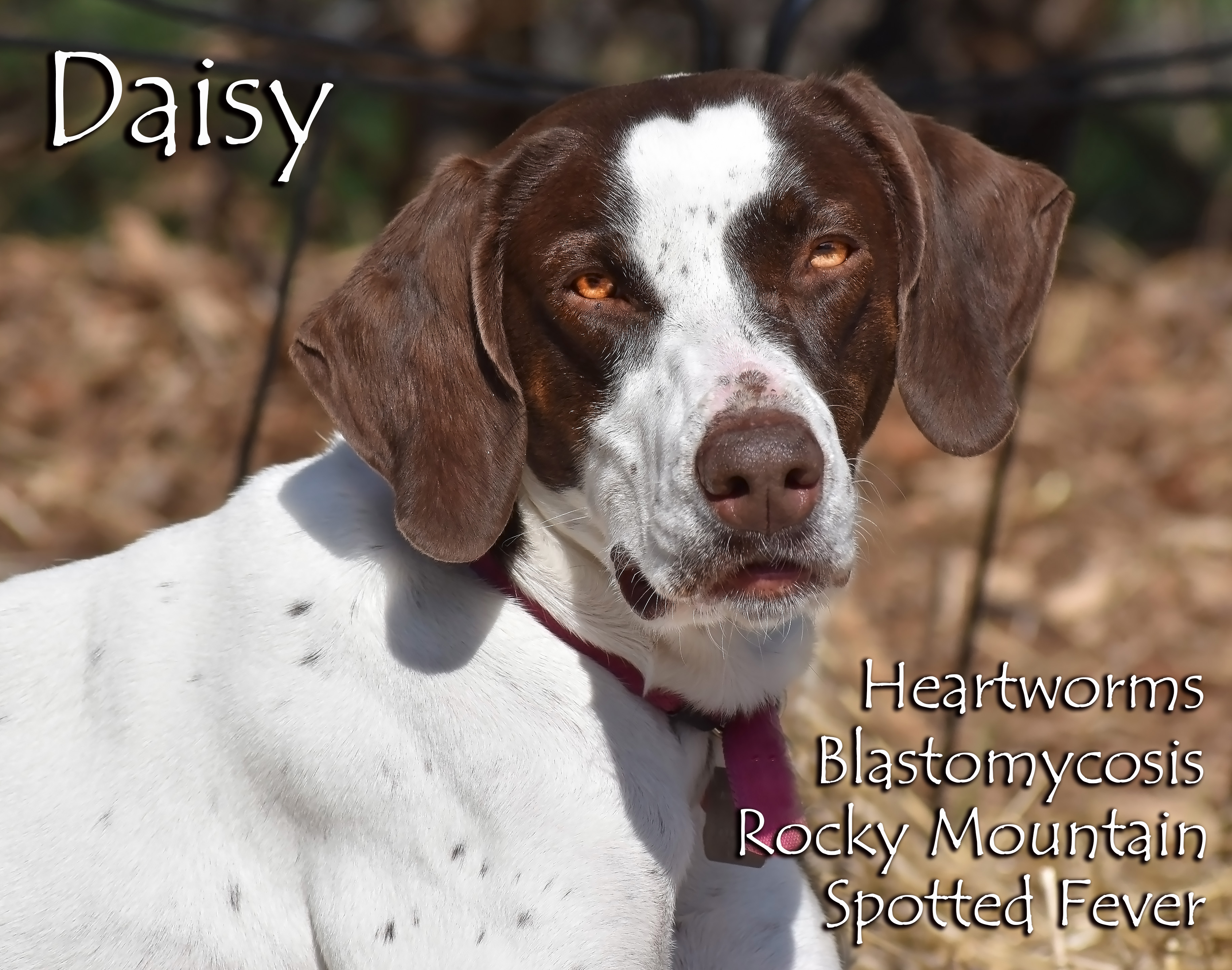Daisy is a beautiful, young, liver and white Pointer we saved from an over-crowded shelter in Tennessee in January. She tested positive for heart worms and while she was in foster care out of state, we started our slow kill program. When she moved to her new foster home in St. Louis, we had her seen by a vet for a cough, but nothing was noted. When she finally moved to foster care in Illinois in April, we got the worse diagnosis that Daisy has Blastomycosis-- a terrible fungal infection in her lungs and her tick serology also showed Rocky Mountain spotted fever.